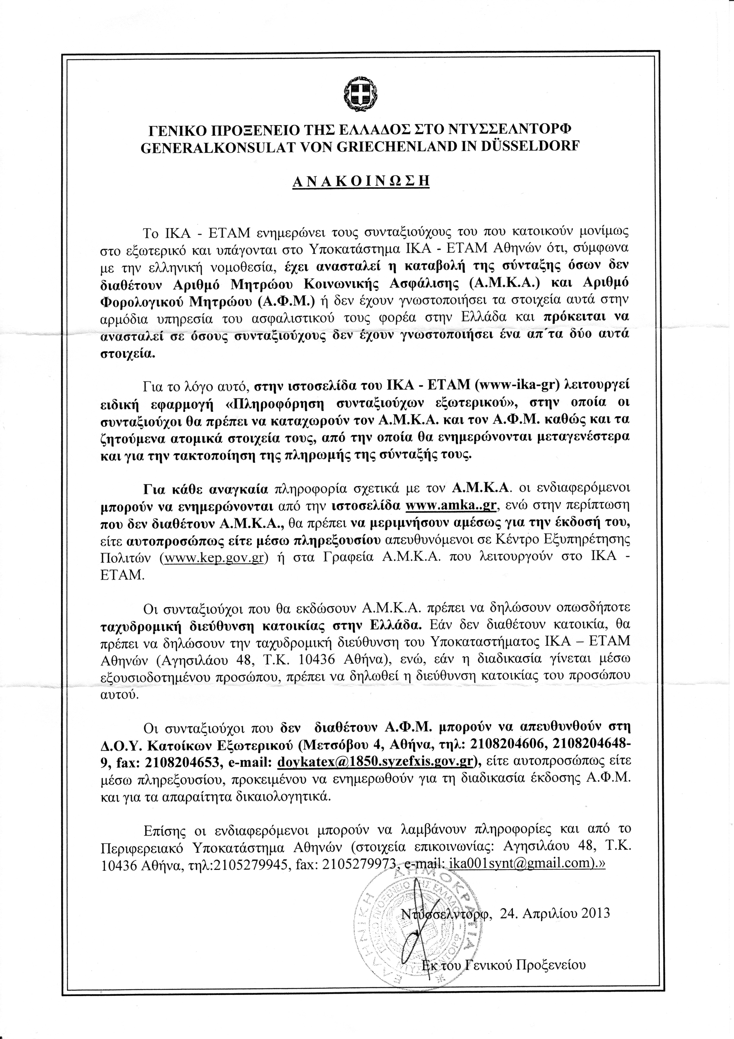 24.04.13 Ανακοίνωση για συνταξιούχους ΙΚΑ - ΕΤΑΜ